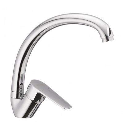 Одноручковый змішувач для кухні CR OMEGA 011 з високим круглим поворотним виливом монтується під один отвір (мийка, стільниці, підвіконня) на гайці. Матеріал корпусу - стійкий до корозії сплав металу (сплав алюмінію з кремнієм). Покриття - дзеркальний хром.