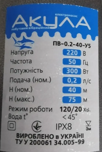 Вібраційний насос "Акула 2" Чудово підходить для викачування рідини з колодязів і свердловин. "Акула" перекачує прісну воду з водойм, колодязів і трубчастих свердловин діаметром від 98 мм. Можливе застосування апарата для подавання води з відкритих водойм — річок, озер, ставків для поливання городів, а також можна використовувати в разі, якщо Ви хочете позбутися небажаної води в льохах або підвалах.