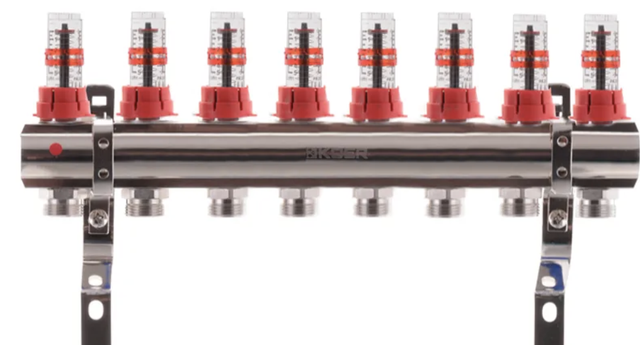 Подаючий колектор (верхній) оснащений прозорими витратомірами, які дозволяють точно контролювати та зручно балансувати подачу теплоносія по кожному контуру теплої підлоги.